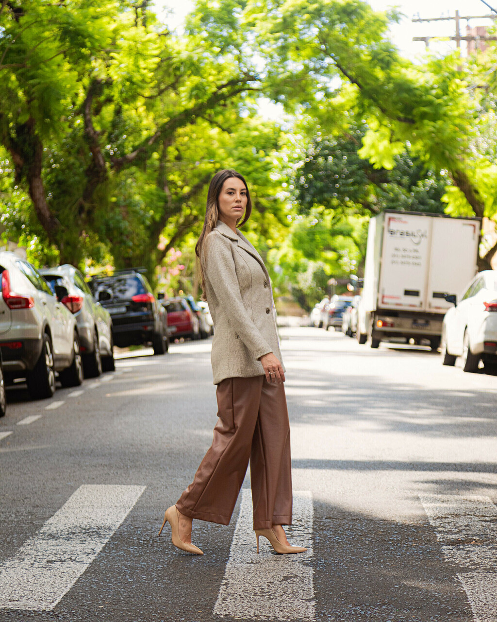 Calça larga modelo pantalona com fechamento por botão de pressão forrado.